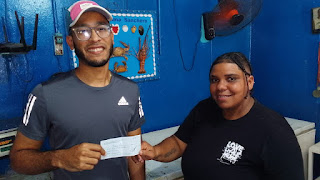 Pie de foto.-Adaury Reyes encargada de venta de la Pescadería Wanda entrega un aporte a Jonathan Castillo organizador del torneo de tenis de campo independencia nacional.